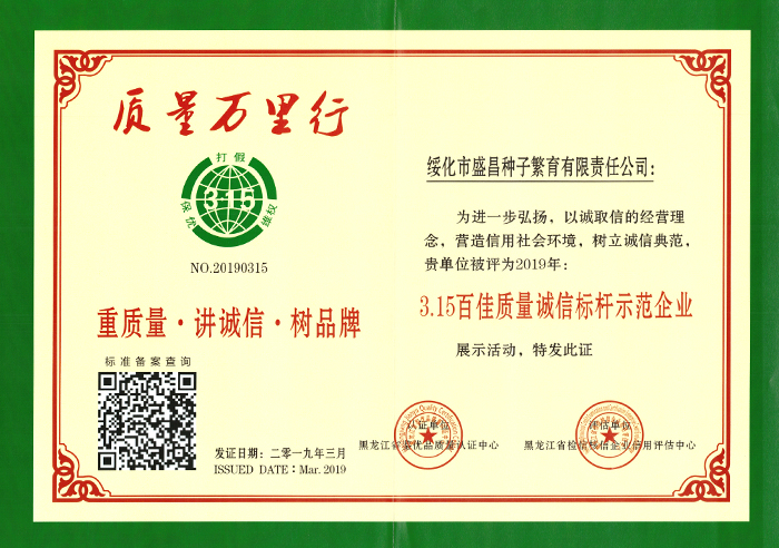 公司具有三大優(yōu)勢:一是科研實力強。我單位形成“工程化”水稻育種組織架構(gòu)和模式,達到國內(nèi)前沿水平。主要品種有:綏粳18、盛譽1號、綏稻3號等,新品種源源不斷的滿足市場及農(nóng)民朋友的需求。二是質(zhì)量有保證。為水稻品種的一致性和真實性檢測提供強有力的科技支撐。公司繁育的水稻種子在產(chǎn)前、產(chǎn)中隨時進行種子質(zhì)量檢測,保證不合格的種子不入庫,不流通,確保種子質(zhì)量。三是品種保真實。我公司承諾只經(jīng)營具有自主知識產(chǎn)權(quán)的品種,絕不以假亂真,不套牌,不做假,保證種子的真實性。我們有責任和義務(wù)為“三農(nóng)”服務(wù),確保農(nóng)民用種安全。我公司向農(nóng)民朋友鄭重承諾:保證品種真實,保證種子質(zhì)量。